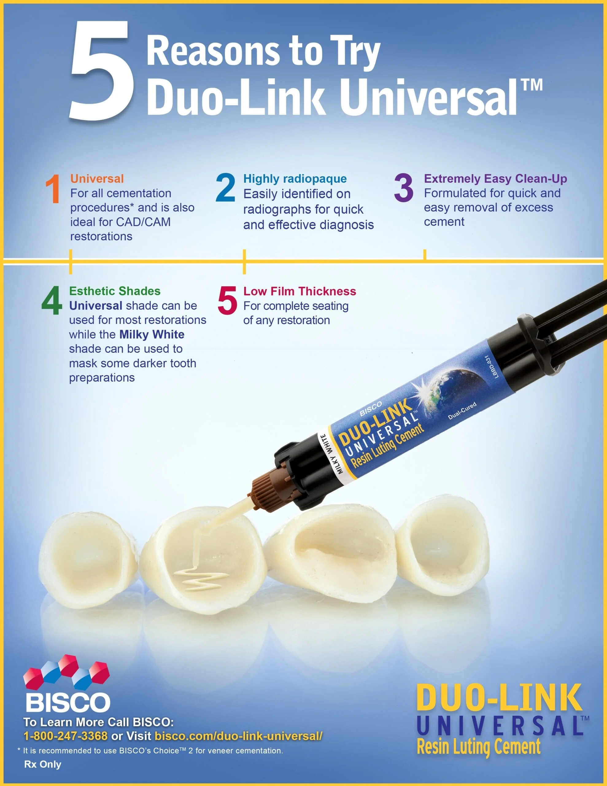 Duo-Link Universal adhesive resin cement is specially formulated for cementation of ALL* indirect restorations. It is intended for use with adhesives that are compatible with all dental materials, including all BISCO adhesives.
