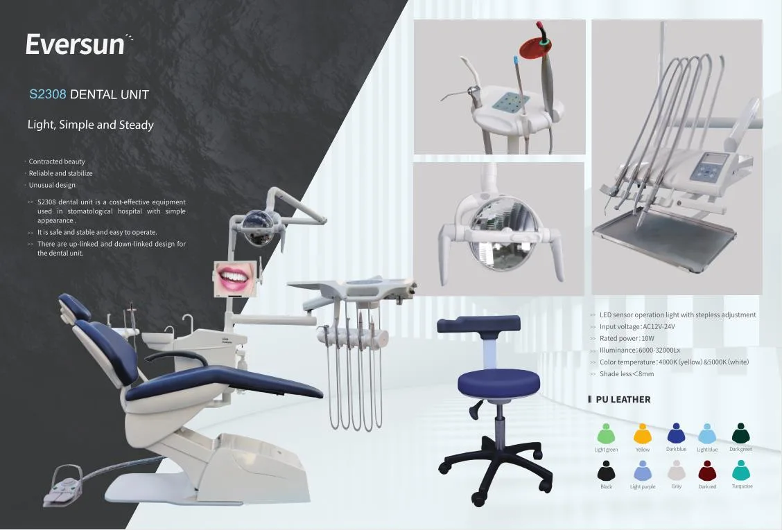 S2308 dental unit is a cost-effective equipment used in stomatological hospital with simple appearance. It is safe, stable and easy to operate. There are up-linked and down-linked design for the dental unit.